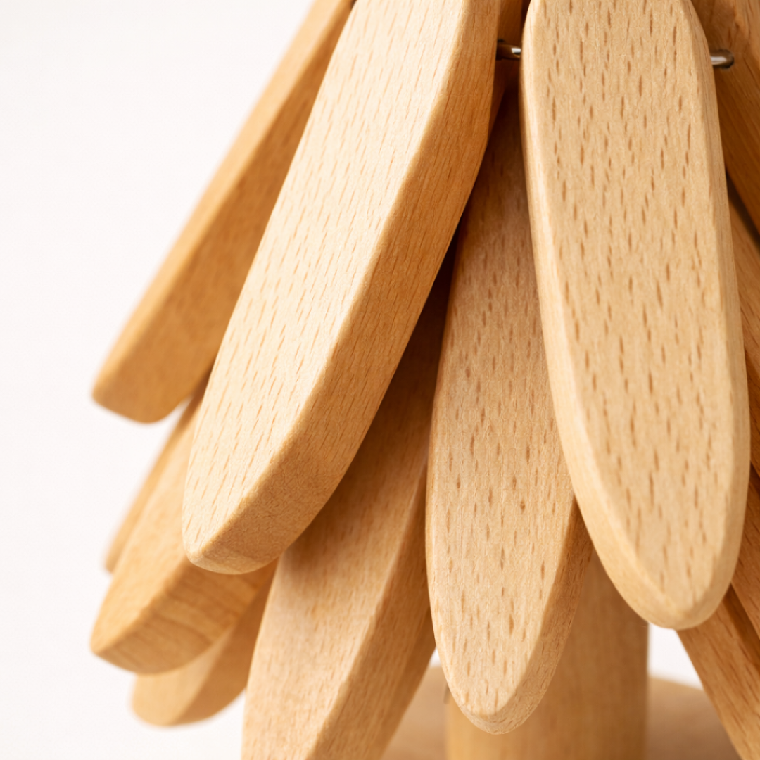 Ahşap katlanır nihale, sıcak tencere, tava ve servis tabaklarını masa veya tezgâh yüzeyinden güvenle ayırmak için kullanılan, doğal ahşaptan üretilmiş çok amaçlı bir mutfak aksesuarıdır.